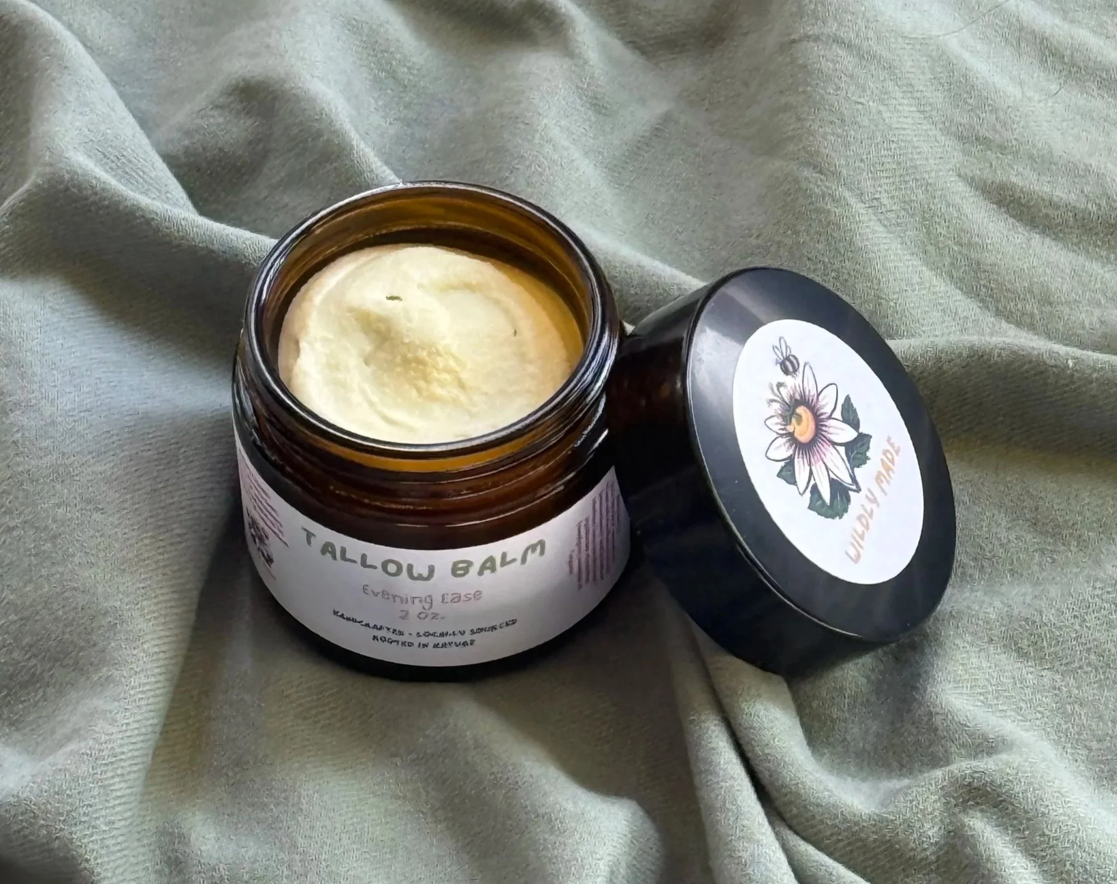 grass-fed tallow and avocado oil infused with Plantago major (plantain)*, Echinacea purpurea (echinacea/purple coneflower)*, and Achillea millefolium (yarrow)* (*organic)